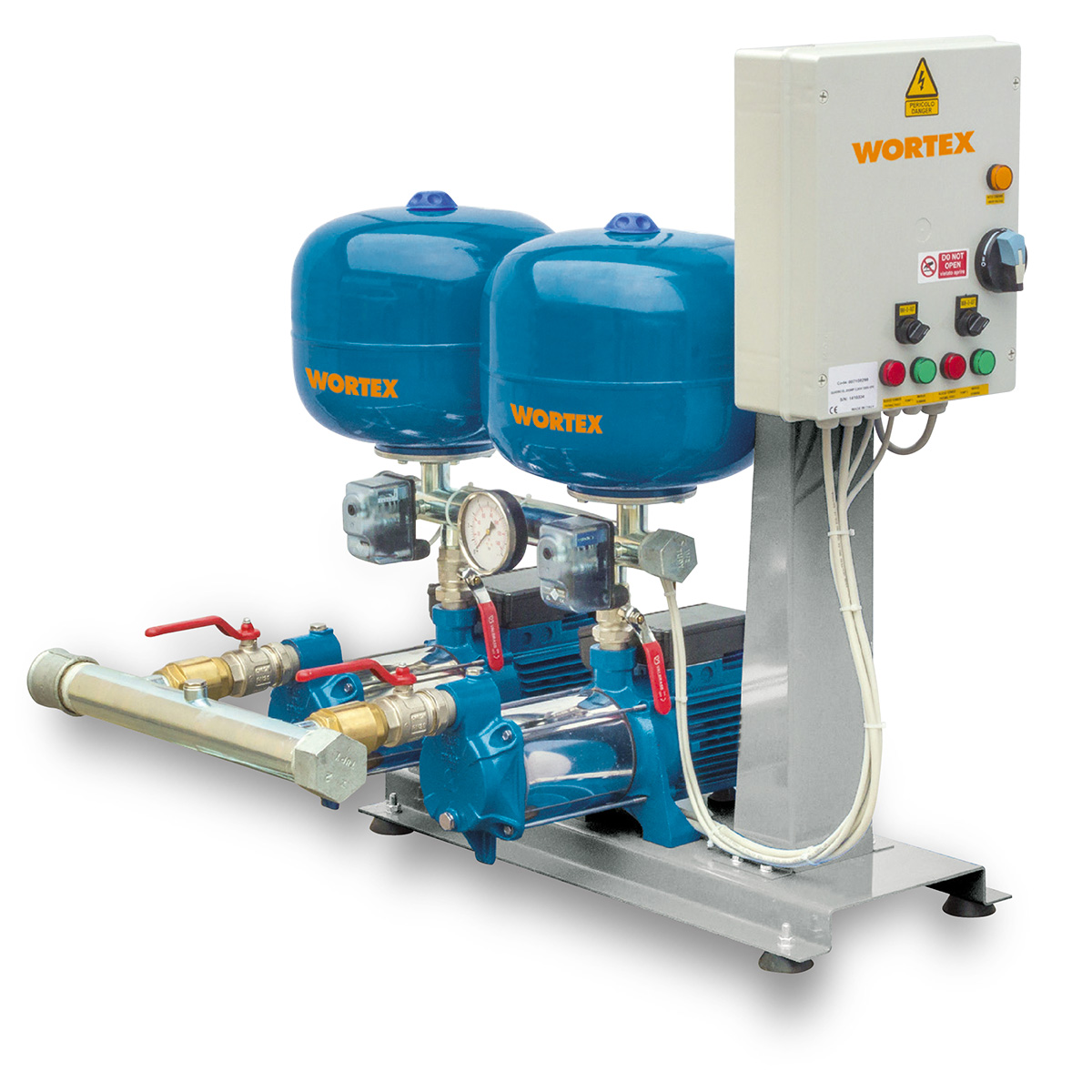 Gruppo di pressione con 2 pompe centrifughe multiranti completo di basamento con antivibranti, collettore di aspirazione e di mandata, valvola a sfera, valvola di non ritorno, con o senza 2 serbatoi a membrana. Quadro elettrico completo di: