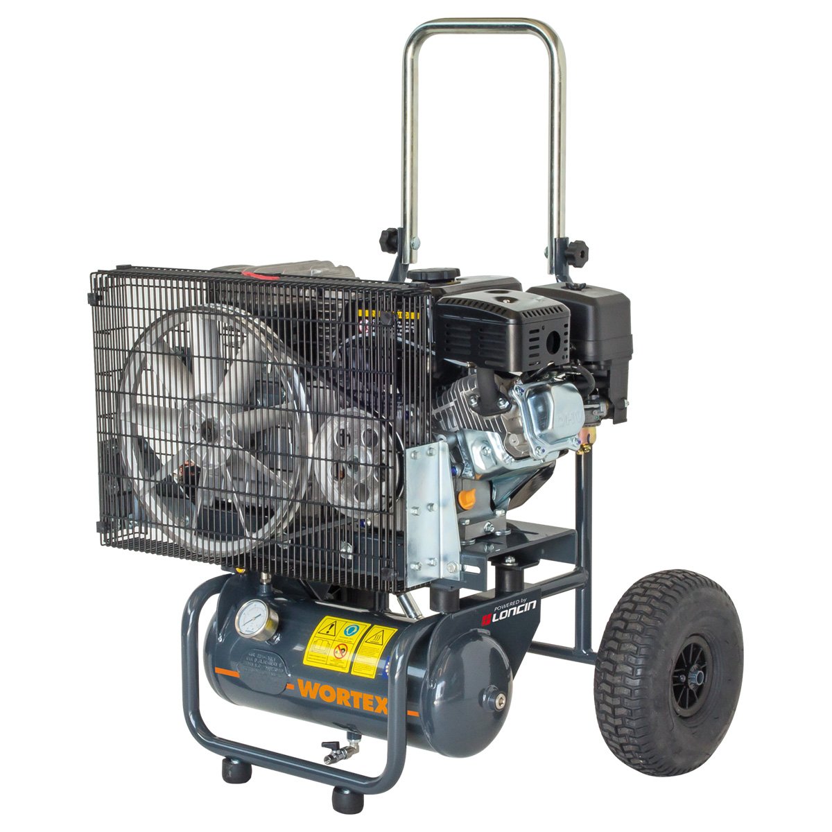 Motocompressore con motore a scoppio a benzina LONCIN da 4 Hp. Avviamento a strappo con fune autoavvolgente. La maniglia pieghevole lo rende estremamente compatto e adatto al trasporto. Un telaio pratico e maneggevole dotato di ruote pneumatiche facilita gli spostamenti anche su terreni accidentati. Testata bicilindrica monostadio con cilindro in ghisa. Valvola automatica di sfiato e messa a vuoto che mantiene la pressione costante nel serbatoio.